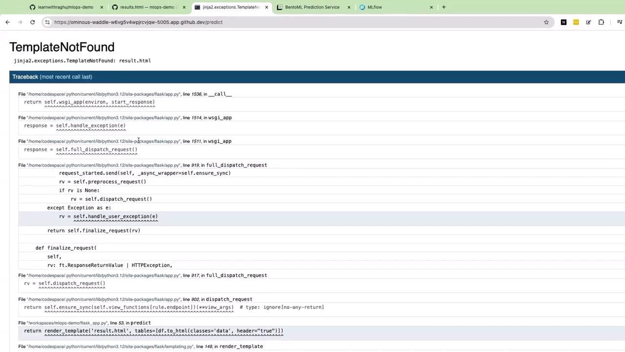 The image shows a web page displaying a "TemplateNotFound" error from a Flask application, indicating that the "result.html" template is missing. It includes a traceback of the error in the code.
