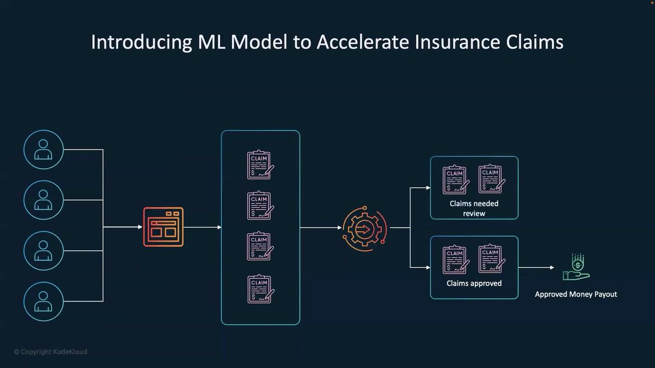 The image is a flowchart illustrating an ML model designed to accelerate insurance claims processing, showing the steps from claim submission to approval and payout.
